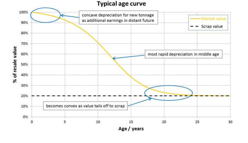 An assessment thereafter is made with regards to the vessels effective age and economic useful life, where factors such as comparison with an asset of like kind, the duration of profitable use, the assets overhaul and rebuild status.
